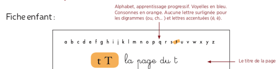 Pour parler de la langue, on a besoin des mots : alphabet, syllabe, lettres… Ici, la page du t, c’est la page de la lettre T /té/, pas du son /teu/. Pour lire, on aborde des lettres, qu’on combine avec les suivantes pour ensuite trouver le sens des mots et phrases. On a besoin de les nommer : les lettres sont les plus petits graphèmes qui permettent de coder la langue.