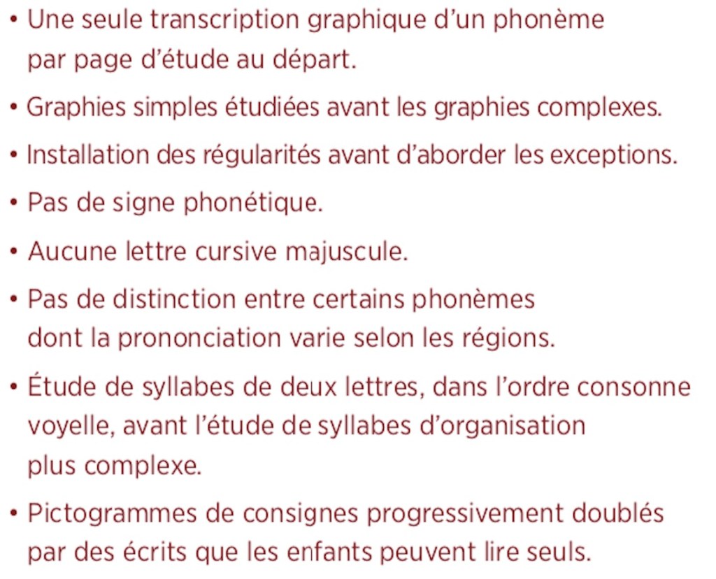 À observer dans les manuels de CP : signes phonétiques, graphies présentées sur une même première page d’étude, présence et conception des jeux de phonologie… et la progression des premières semaines. « une étude des correspondances graphèmes-phonèmes les plus régulières et les plus fréquentes dès le début de l’année, des textes déchiffrables. » précise le guide Pour enseigner la lecture et l’écriture au CP, 2018, Ministère de l’Éducation nationale et de la Jeunesse.
