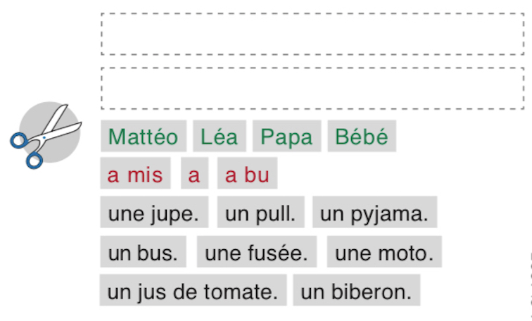 Intérêt de faire manipuler des étiquettes mots, sur papier ou tablette ou tableau interactif, jusqu’à que l’ordre des mots prenne sens ! Il s’agit de partir de l’écrit pour lui donner du sens, en s’appuyant sur des éléments textuels ou illustrés.